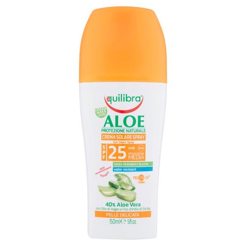Crema solare spray aloe 25 e 15, protegge la pelle dalle scottature e assicura un’abbronzatura sana e naturale. L’olio di carota e la vitamina E stimolano le naturali difese della pelle. la tollerabilità del prodotto, fototestata, è rafforzata dalla presenza della aole e dall’assenza di profumo. L’aole vera Equilibra contenuta in importanti quantità (40%), idrata, rinfresca e dona sollievo alla pelle offrendo una protezione potenziata